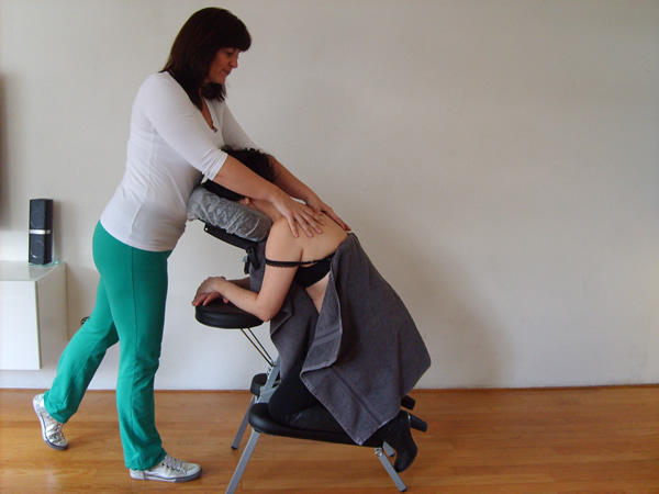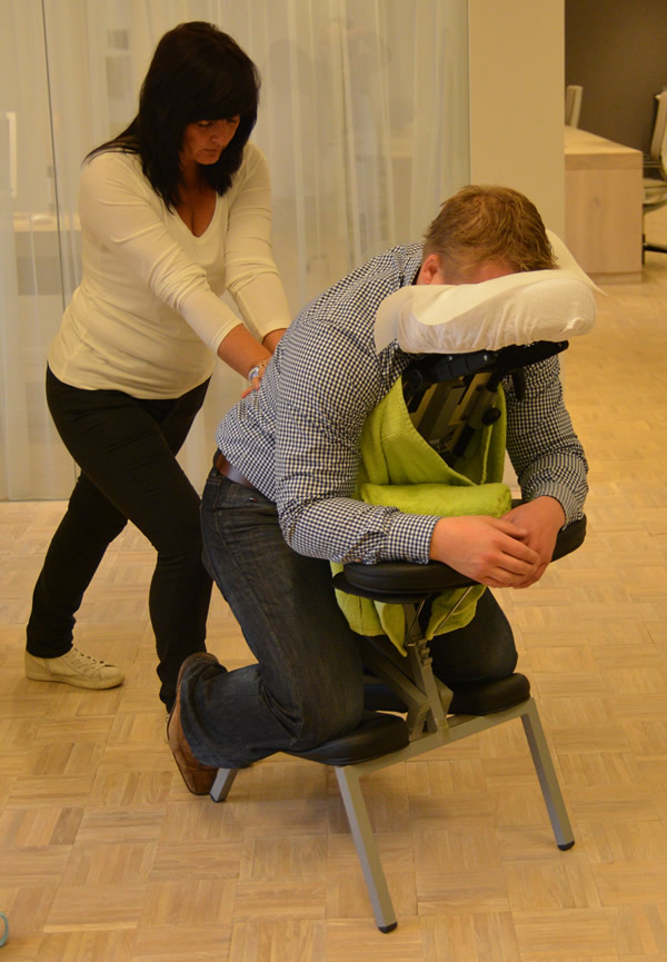 Dit is een stoelmassage waarbij met olie wordt gewerkt en hiervoor hoeft alleen de (boven) rug ontbloot te worden.